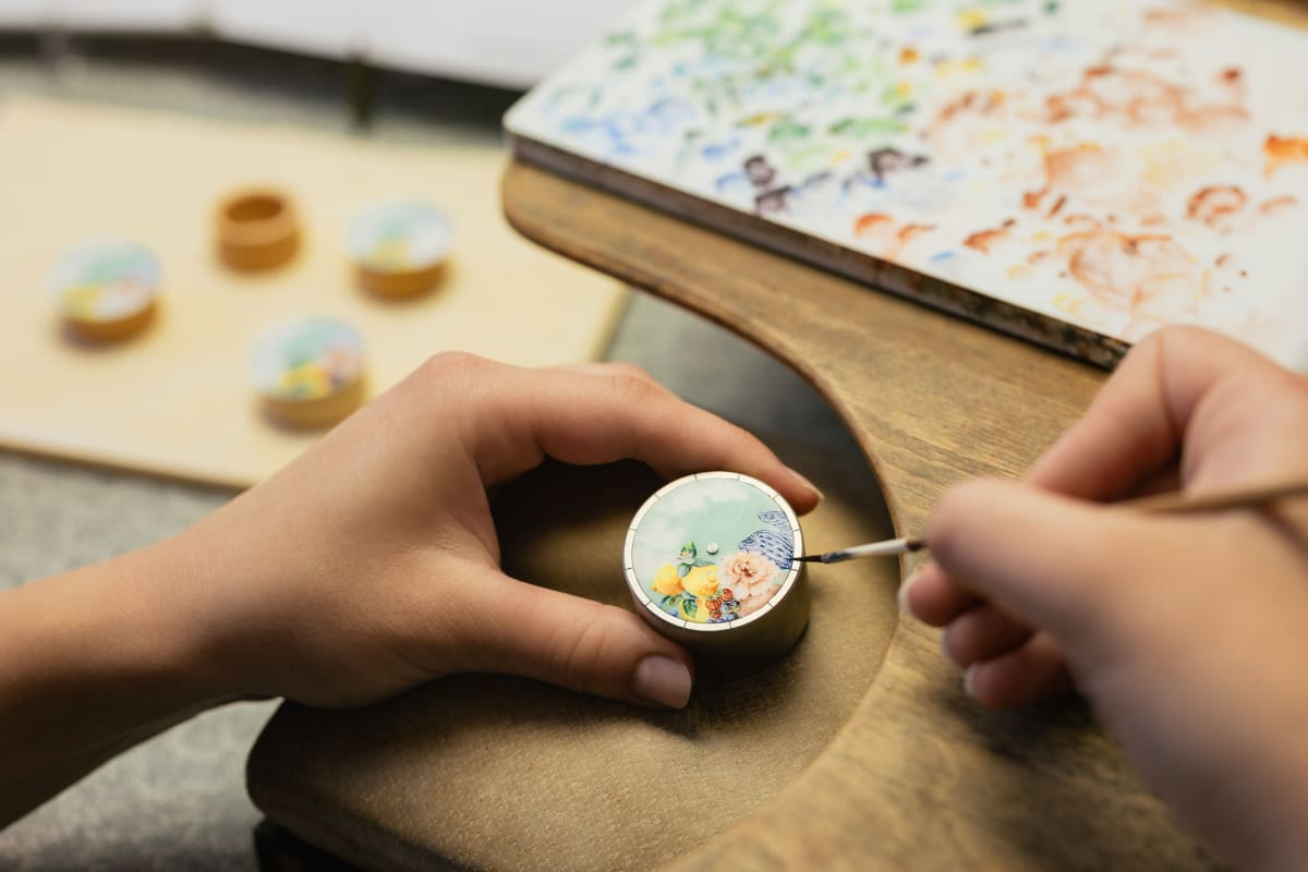 Il processo inizia con una prima cottura a circa 1.400 gradi Celsius. A questa temperatura la porcellana si solidifica dopo aver assunto quel profilo piano indispensabile per un quadrante orologiero. Dopo questa fase viene applicato lo smalto bianco o verde celadon, seguito da un’altra cottura ad alta temperatura.