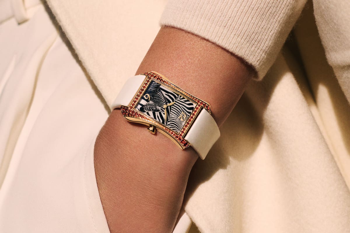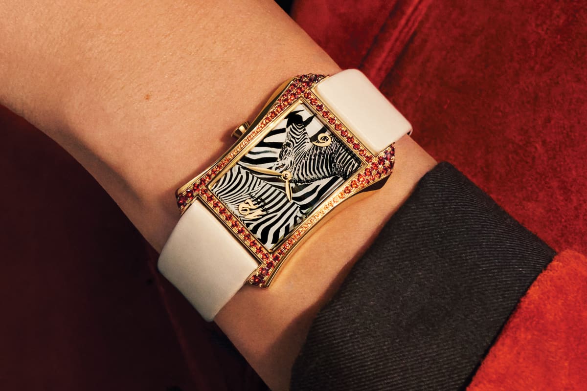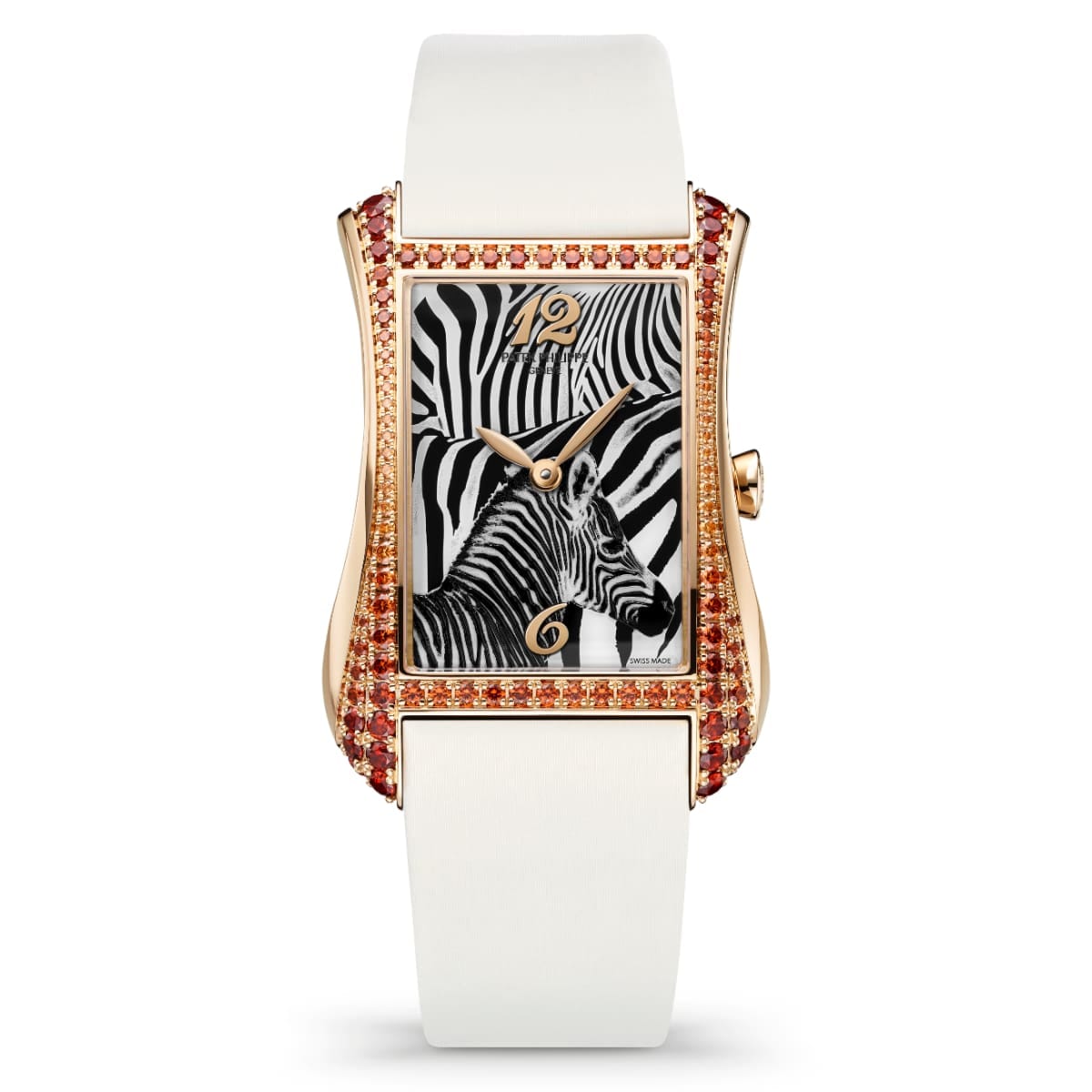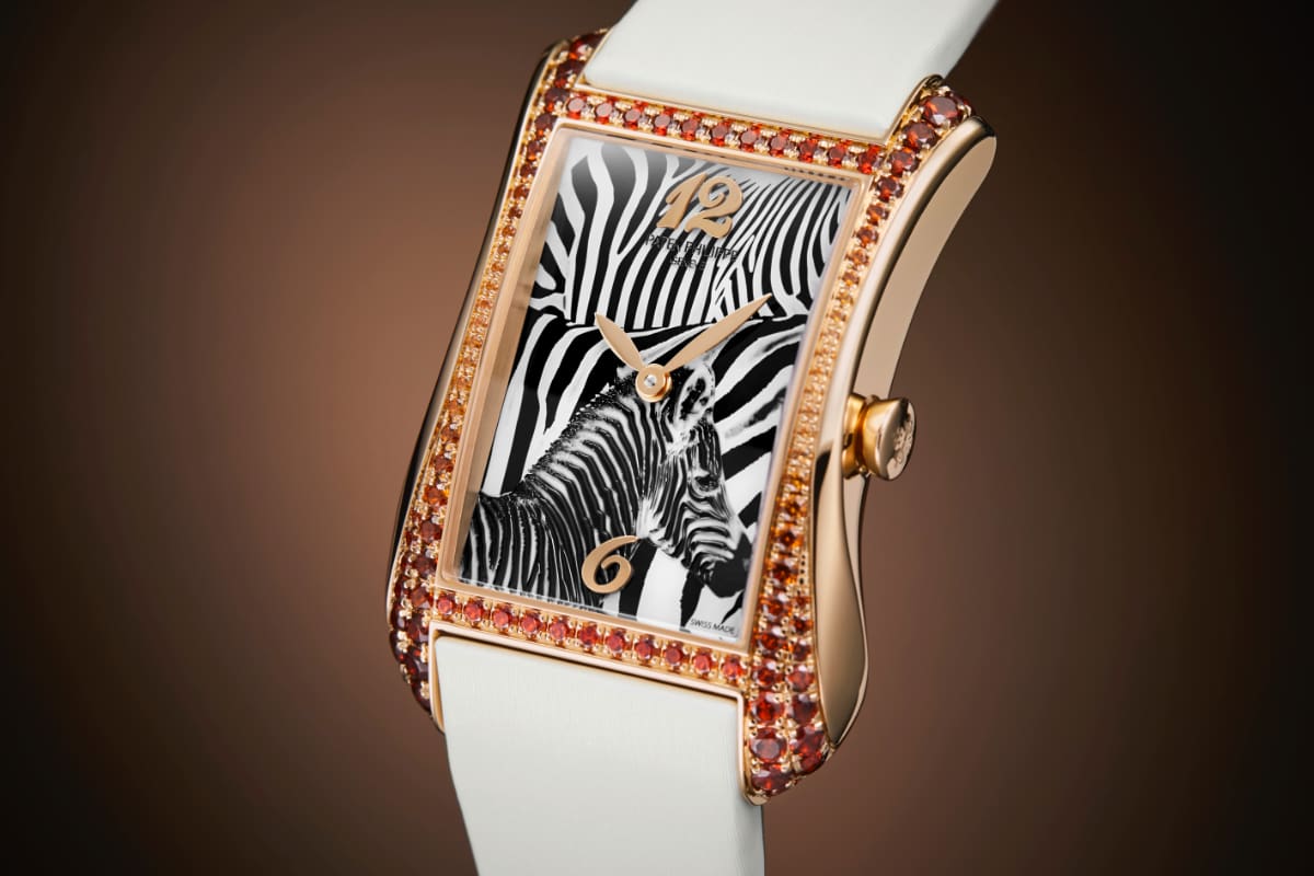 Questa versione “Zebra” si basa sul modello più grande introdotto nel 2023. Parliamo di una cassa form (ovvero, non rotonda) in Oro rosa 18k. Ma la sua vera particolarità è il design Art Déco che si esprime in una leggera e sensuale cassa asimmetrica: se la guardi bene, noterai che le anse inferiori si allargano morbidamente verso l’esterno.