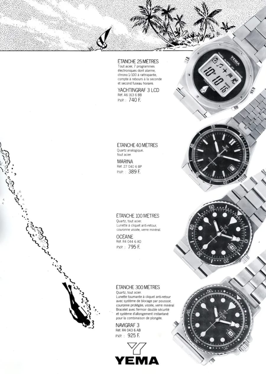 L’orologio Yema Navygraf (a volte chiamato “Navigraf”) è considerato uno dei capitoli più affascinanti della storia dell’orologeria francese. Nasce alla fine degli anni ’70, creato da Jean Müller, che fu direttore del design di Yema dal 1975 al 1982 e una figura fondamentale per la notorietà del marchio. Il Navygraf “I” fece la sua comparsa nel catalogo Yema con elementi distintivi che sarebbero diventati iconici per l’intera linea: le lancette giallo brillante e i particolari indici a forma di punto esclamativo. La sua funzione originale era quella di orologio subacqueo con impermeabilità fino a 660 piedi, circa 200 metri. A differenza del più complesso Superman, il Navigraf fu concepito come un orologio subacqueo leggermente semplificato, rivolto principalmente ai subacquei ricreativi, in pratica uno skin diver.