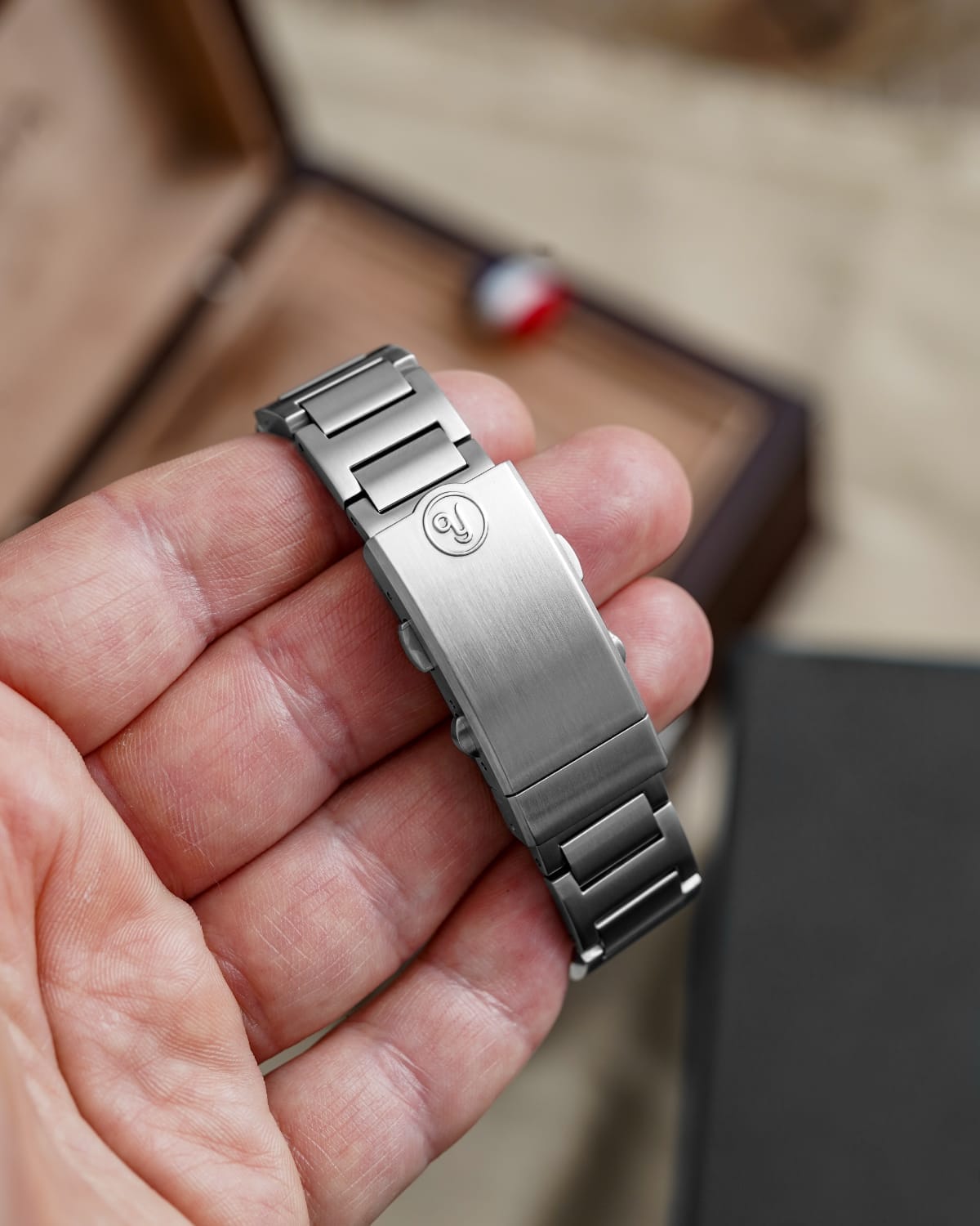 Il Navygraf Madreperla può essere indossato con due opzioni. Il bracciale in acciaio 316L integrato nella cassa presenta una finitura mista: maglie centrali spazzolate alternate a maglie laterali lucide, un contrasto che alleggerisce visivamente il bracciale e aggiunge eleganza. La costruzione integrata significa che il bracciale è progettato specificamente per questa cassa, con un raccordo perfetto alle anse.